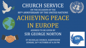 On Sunday 26th October, 18:15 at St Nicholas Church, Church Green, Harpenden AL5 2TP, there will be a UN at 80 service with an address on Achieving Peace in Europe by Lt General Sir George Norton (former UK Military representative to NATO). Register here to attend.