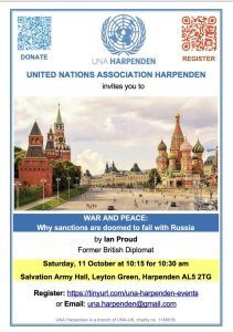 On Saturday 11 October at 10:15 for 10:30 am, UNA Harpenden will be hosting a public lecture on War and Peace – why sanctions are doomed to fail with Russia by Ian Proud, Former British Diplomat, at the Salvation Army Hall, Leyton Green, Harpenden AL5 2TG. Click here for more information about the talk. Register here for the talk.